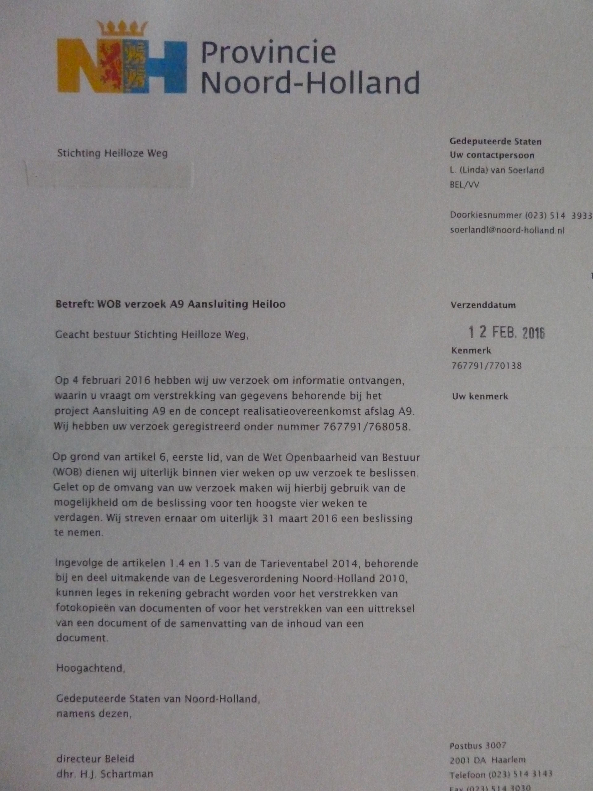 WOB verzoek inzake kosten en effecten Aansluiting A9